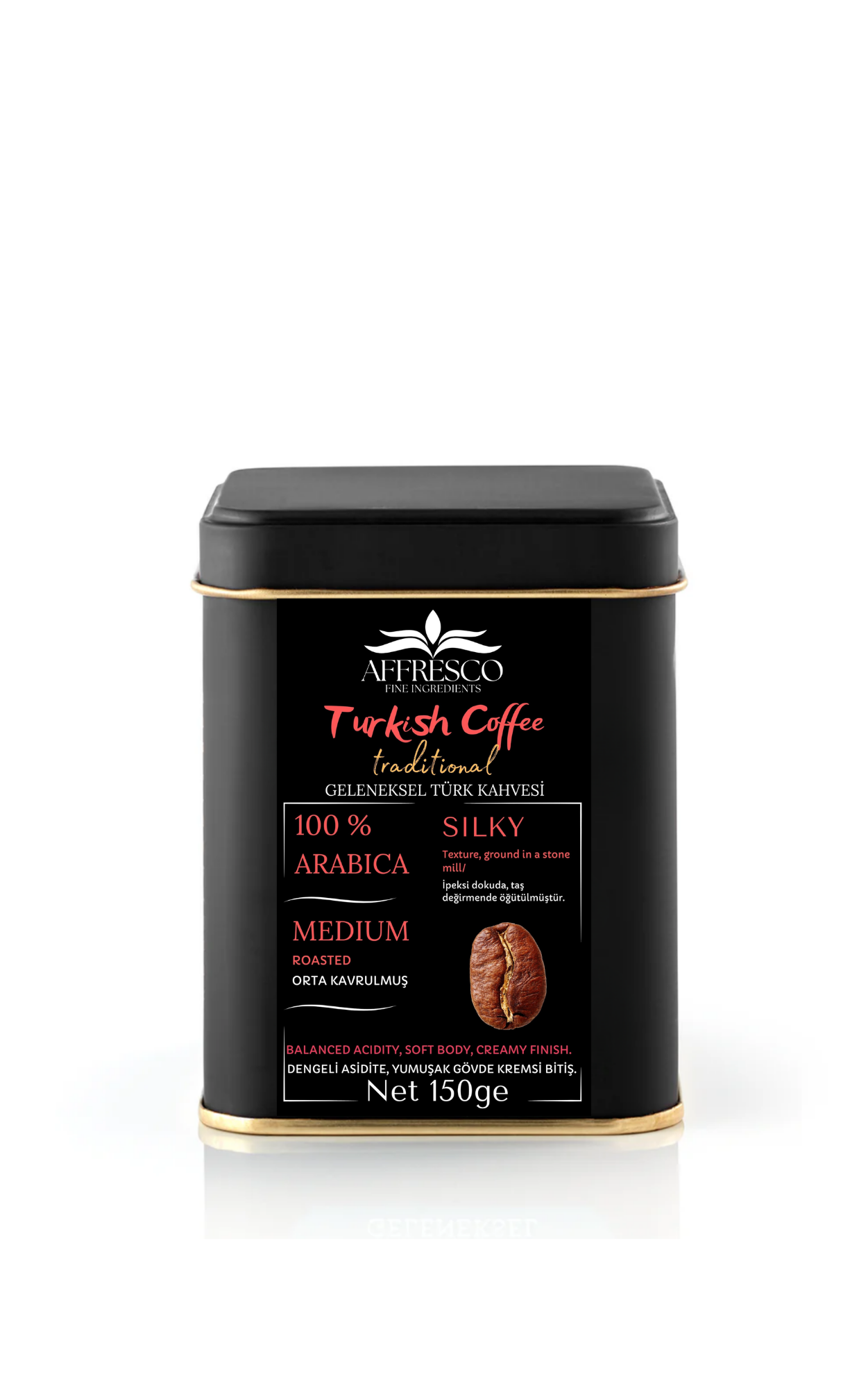 Affresco Geleneksel Türk Kahvesi, özenle seçilmiş Arabica çekirdeklerinden üretilmiştir. Orta kavrulmuş yapısıyla zengin bir aroma ve dengeli bir tat profili sunar. Güneşte doğal ortamda kurutulmuş çekirdekler, taş değirmende geleneksel Türk kahvesi kıvamında öğütülmüştür.